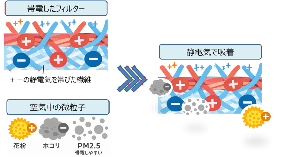 以下のイメージ図のように、+-の静電気を帯びた繊維が花粉やホコリ、PM2.5などの粒子をキャッチしています。
