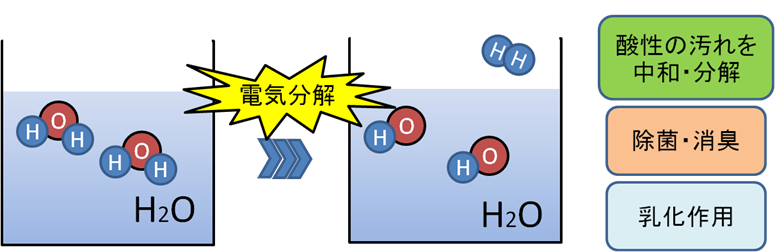 pHの高さを活かした分解作用で酸性の汚れにとても効果的ですが、電解質の違いによる特徴にはご注意ください。
