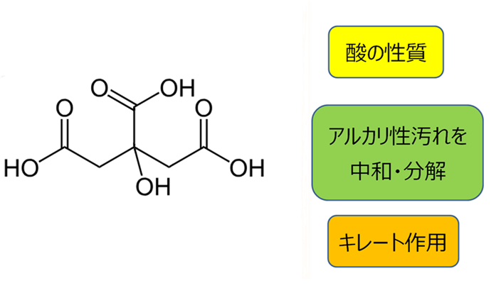 - 掃除では、アルカリ性汚れとの中和反応や金属イオンとのキレート作用で活躍